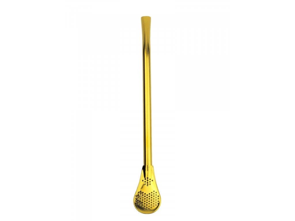 Η χρυσή bombilla είναι ένα κομψό μεταλλικό καλαμάκι με φίλτρο, που χρησιμοποιείται για την κατανάλωση yerba mate. Είναι κατασκευασμένο από ανοξείδωτο ατσάλι ή ορείχαλκο με χρυσή επιφάνεια, που του προσδίδει πολυτελή εμφάνιση και αντοχή στη διάβρωση. Πλεονεκτήματα: Κομψό σχεδιασμό: Προσδίδει μια πολυτελή εμφάνιση στο τελετουργικό της κατανάλωσης του ματέ. Πρακτικότητα: Το φίλτρο εμποδίζει τη διείσδυση των φύλλων. Ανθεκτικότητα: Μεγάλη διάρκεια ζωής και υγιεινή συντήρηση. Χρησιμοποιείται τοποθετώντας το μέσα στην καλαμπάσα με το yerba, όπου επιτρέπει την κατανάλωση ενός καθαρού ροφήματος χωρίς φύλλα. Πρόκειται για ένα εξαιρετικό αξεσουάρ για τους λάτρεις του ματέ.